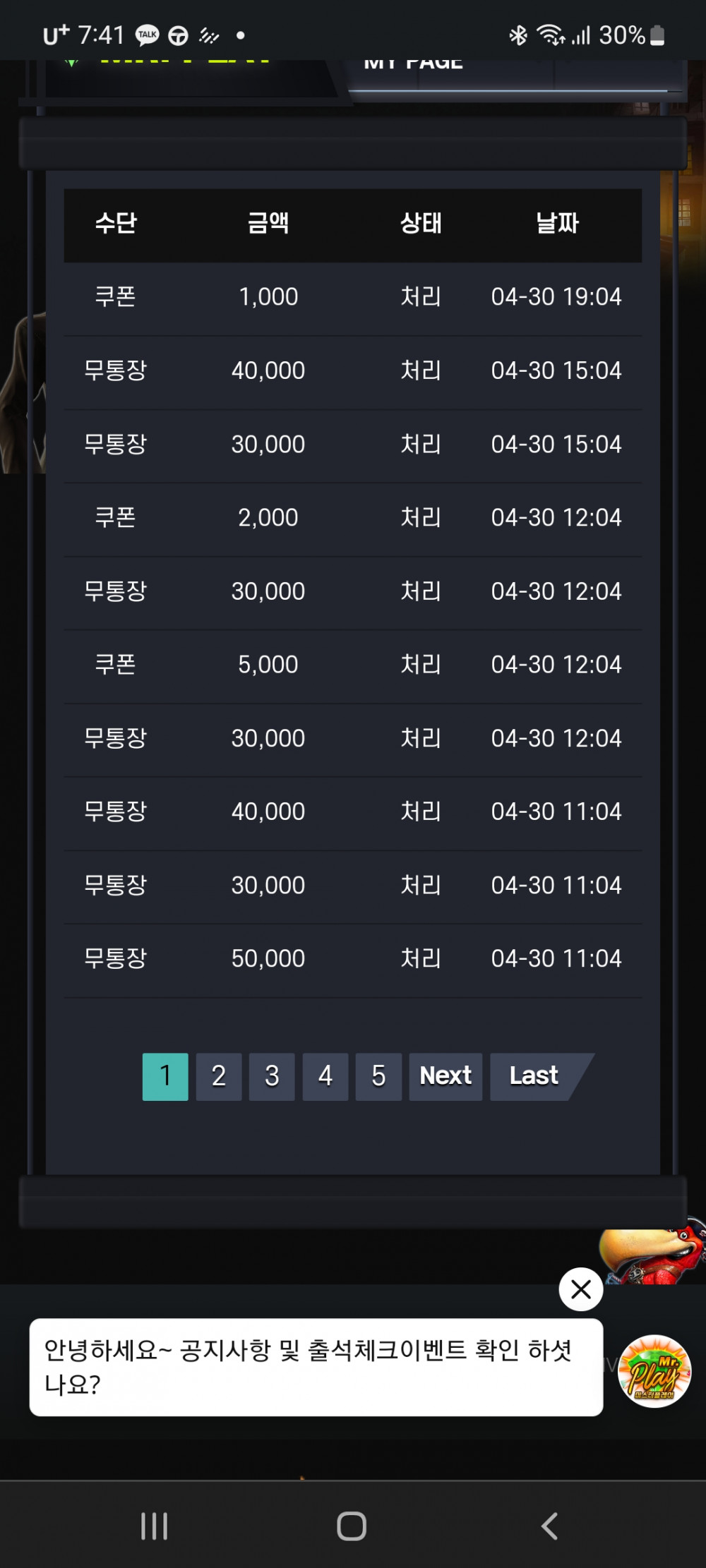한달개근으로 50짜리 쿠폰으로 67만원 환전했네요